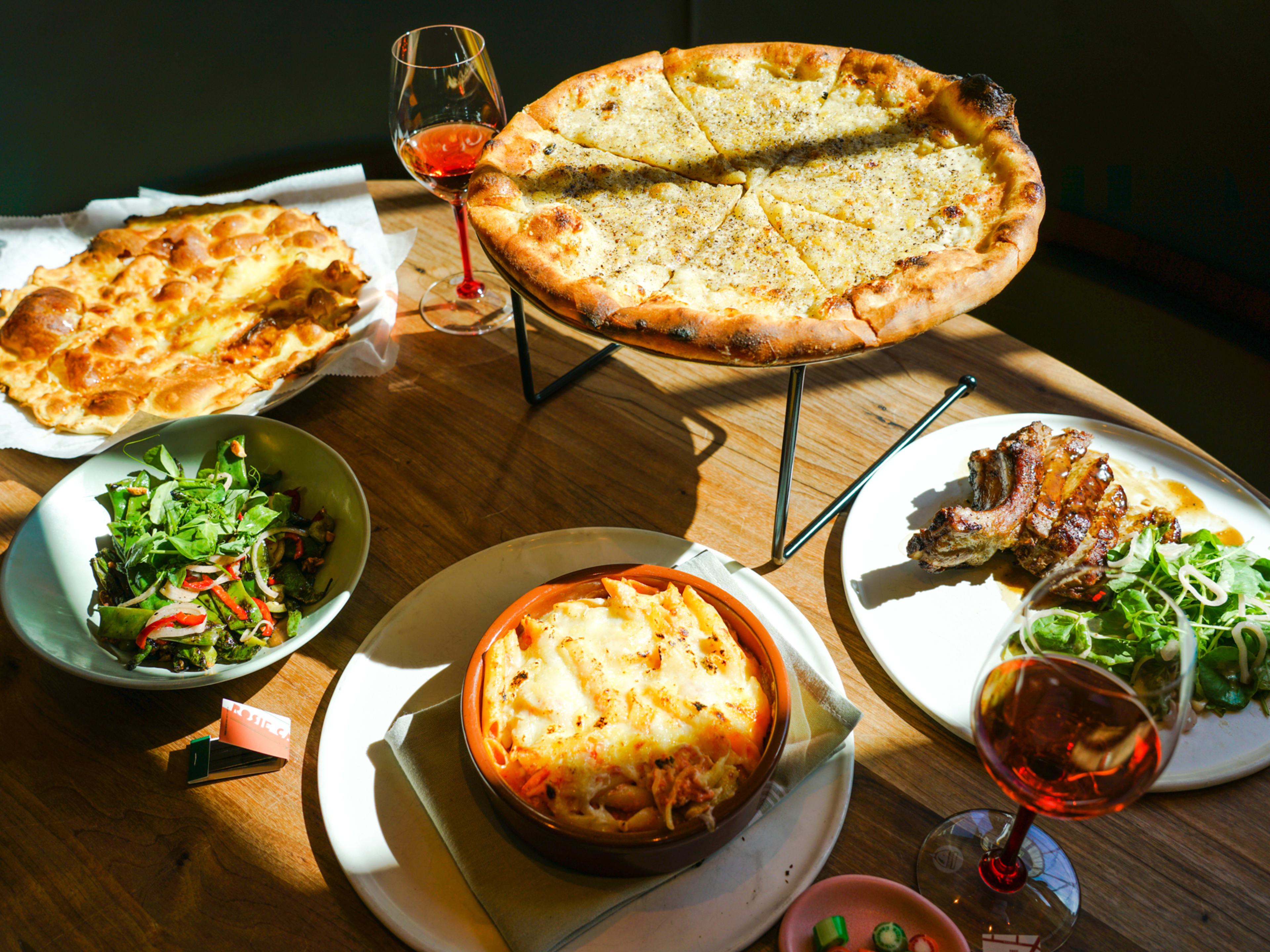 "Anticipation is a hell of a drug. Whether it’s the rush of adrenaline before diving off of a cliff, the queasiness of a first date, or receiving a “your package has shipped” notification, there’s something about the build up to a great experience. And the Italian restaurant Rosie Cannonball in Montrose knows exactly how to wind you up. There’s fanfare with a splash of free lambrusco when you first arrive, luxurious and spacious seating, and gorgeous amber mood lighting. You’re almost holding your breath, expecting a truly stunning time through and through. But Rosie Cannonball just doesn’t stick the landing. The restaurant feels stuck in time at golden hour. Its interior is dripping in custom millwork, inlaid rattan, and slabs of chiseled rock. The warm, inset lighting around the ceiling makes everything look ravishing and beautiful, including you, your date, and even the many houseplants throughout the dining room. It’s like the movie set of a restaurant that’s been there for decades, waiting for someone to switch the lights back on. Also, there are fabulous and frankly kind of sexy bathrooms you should very much check out. The meal starts with a complimentary splash of Lambrusco and a phenomenal blistered bean dish from the wood-fired grill. It’s smoky and bright with herbs and chili. This dinner is going to be incredible, you think. You feel as though you're about to slurp spaghetti while having your portrait taken, like a model laughing and raising a forkful of salad. The cacio e pepe pizza is indeed remarkable, with a crispy and charred crust. But the focaccia comes out sitting in a pool of oil, and the lamb alla genovese only has a schmear of the promised gremolata. The grilled pork chop is an overcooked brick. Then a terrified server awkwardly struggles with a plastic wand lighter for more than a little while, trying to flambé a tableside penne alla vodka. It’s all for show, not flavor. We’re not even sure why the simple, cheesy pasta was on fire at all. And as you sit there, hoping there’s some surprise or maybe even just another free lambrusco , nothing happens. You never dive off the cliff, the first date peters out into awkward silence, and your package? It got lost in the mail. All in all, Rosie Cannonball is a place where you go with your friends to feel bougie and drink wine and not pay much attention to the food, which is only occasionally great. It’s a beautifully designed restaurant, and all of the hallmarks of service and the right wine list are there, poised and ready. But the payoff never fully arrives. " - Chelsea Thomas