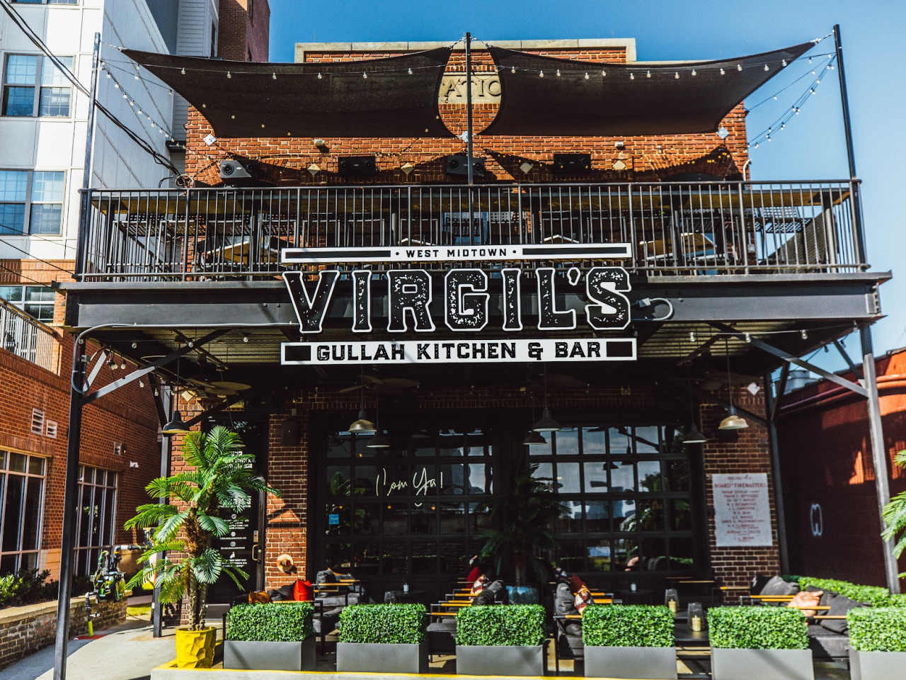 "Day or night, the patio space at Virgil’s is always a scene. Small palm trees on the outdoor space, strong cocktails that remind you of vacation, and pulsating music transform this normally uneventful West Midtown strip into a summery hotspot. On those nice days, Virgil’s fourth wall/garage door is up, so you get the full open-air dining experience whether you’re seated on the actual patio or in the main dining room. There’s also an open-air rooftop space, which gives you views of the city skyline. But whether you come for mimosas and crab-topped shrimp and grits for their Soul Brunch or are just there to socialize over fried wings and their dangerously good Geecheeritas (their house margarita made with Henneseey and Grand Marnier), it’ll be a nice day well spent." - Nina Reeder