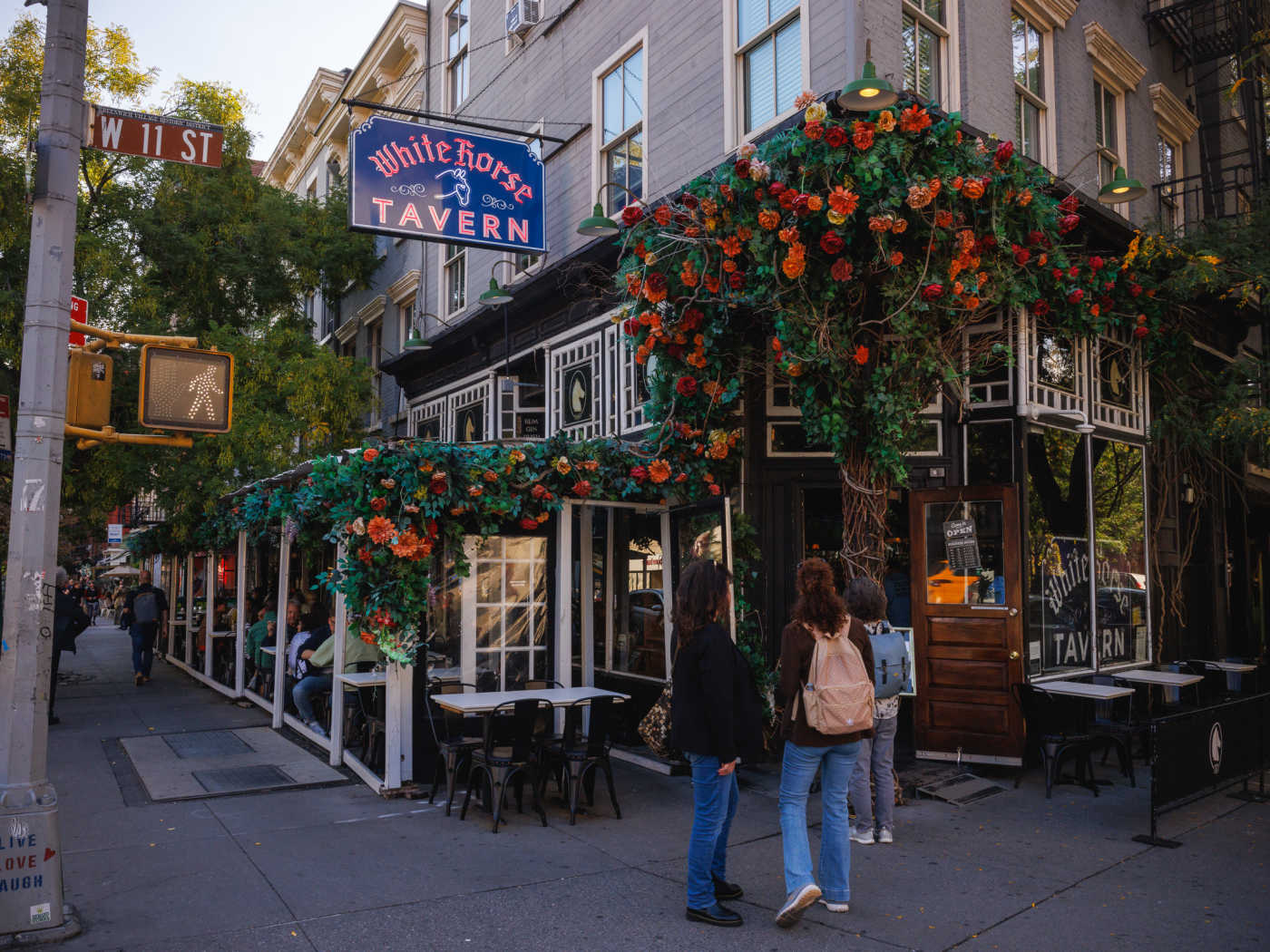 "This 1880 landmark is a useful way station for anyone passing through the West Village, waiting for a table at a nearby restaurant, or otherwise hoping to rest their legs for a round or two. We wouldn’t suggest going too far out of your way to visit, but it’s worth stopping in at least once, for a sip of New York history. The White Horse Tavern was at one point a longshoreman’s hangout, then hosted an impressive resume of literary regulars like James Baldwin and Jack Kerouac. Perhaps most notorious among those patrons is the Welsh poet Dylan Thomas, who is said to have died after a whiskey binge here in 1953, not going gentle into that good night. (The spooky fellow making direct eye contact with you from his portrait on the wall? Yeah, that’s him.) photo credit: Alex Staniloff photo credit: Alex Staniloff photo credit: Alex Staniloff Pause Unmute Today, the spacious, tin-ceilinged bar combines three very different drinking experiences in one. The extensive sidewalk seating is decorated with an abundant canopy of wedding-appropriate (or at least brunch-appropriate) fake florals. The first room is not unlike a sports bar, bright during the day from the sun streaming through the windows, and not too dark at night, either, thanks to the TVs mounted around the room. We have a soft spot for the back, which feels more like a red neon-lit dive. Wherever you sit, the good news is that a glass of White Horse Ale is only $5 during happy hour. While you’re there, play a game with your friends to see who can count more white horse figurines among the decor." - Molly Fitzpatrick