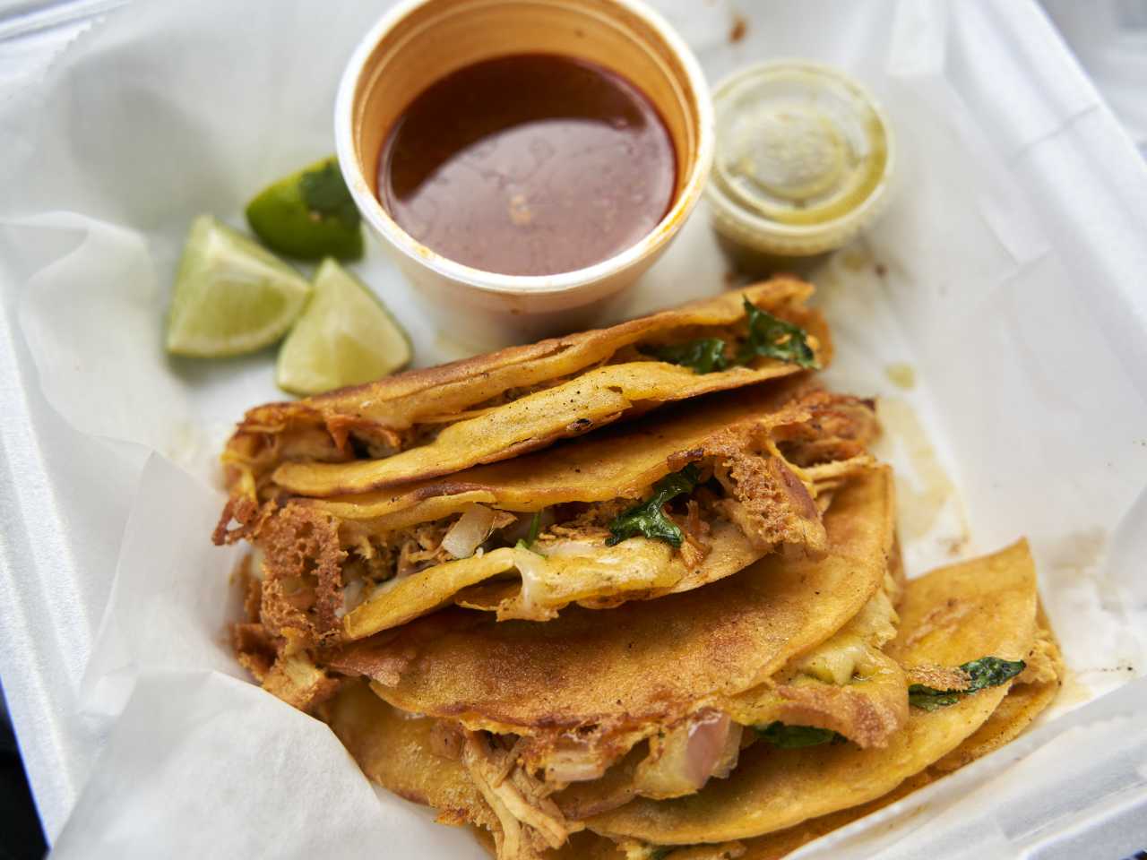 "Slapping Tacos pops up in gas stations and parking lots. All they need is a tent and some tacos to draw crowds. They quickly became a social media sensation thanks to their incredible birria taco, which is the thing to order here. Our favorite is the ground beef birria taco stuffed with plenty of perfectly seasoned juicy beef, globs of stringy mozzarella cheese, and onions. The amount of oil leftover on the parchment paper is proof enough that these tacos come loaded with juicy, salty, fatty flavors that slap (we had to do it). The consomé sauce is rich and delicious, and if you love it so much you’d like to drink it (we’re guilty), order a ramen bowl (if they have it), which uses the broth as a base." - juli horsford, demarco williams
