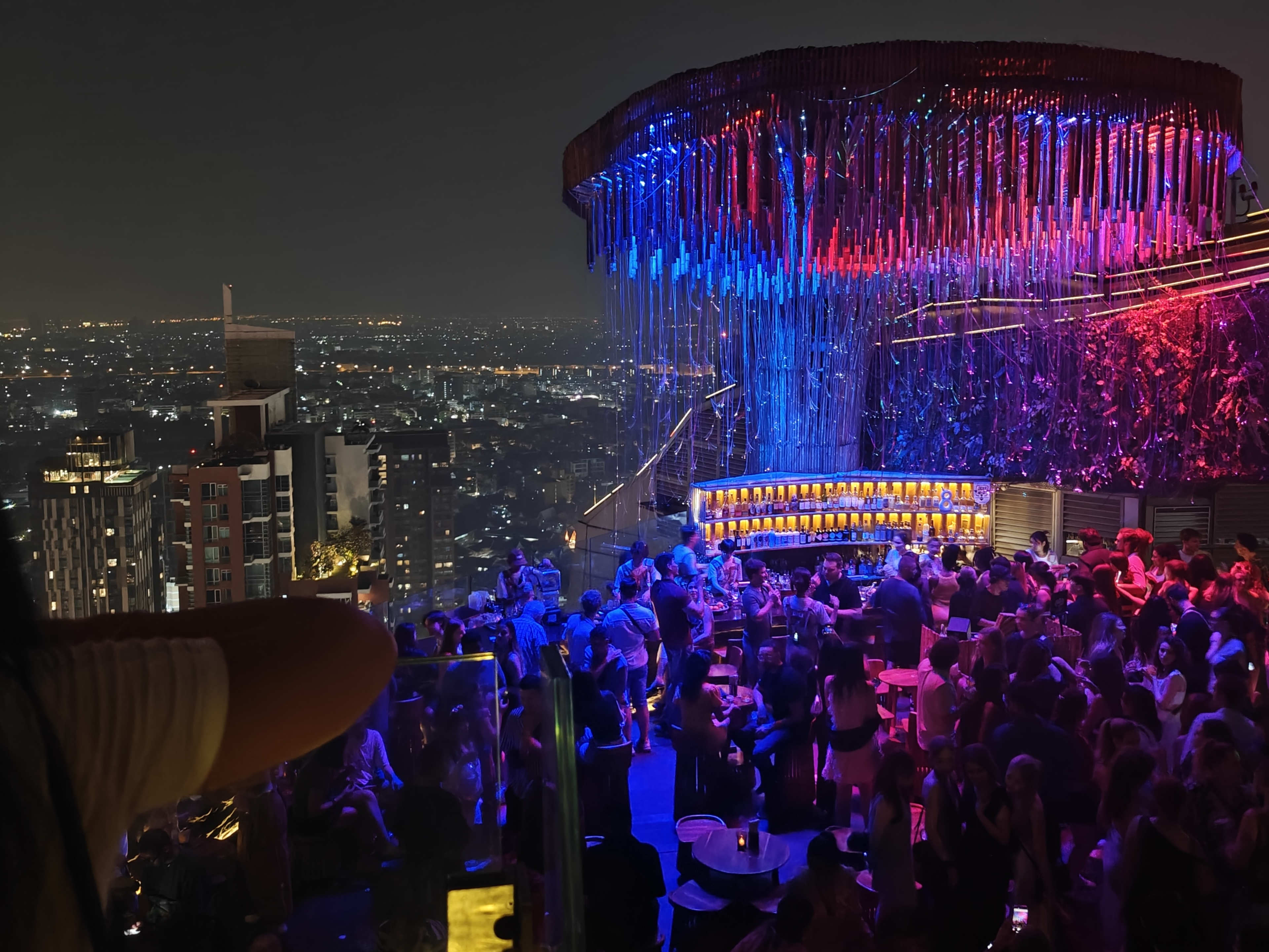 "The 46th floor of the Thonglor area’s T-One Building is home to this high-energy rooftop bar with a 360-degree view of the city. Although forest-themed decor isn’t the most novel idea, the giant LED tree above the main bar is as captivating as the views of the skyline behind it. There’s also a higher vantage point you can walk up to, equipped with its own bar. The cocktails are mostly straightforward, tropical-style drinks, with a few low-ABV options if you want to keep things tame. But let’s be real, if you’re coming to Tichuca, you’re not keeping things tame. Skip to the later pages to see the list of tequilas they serve." - vichayuth chantan