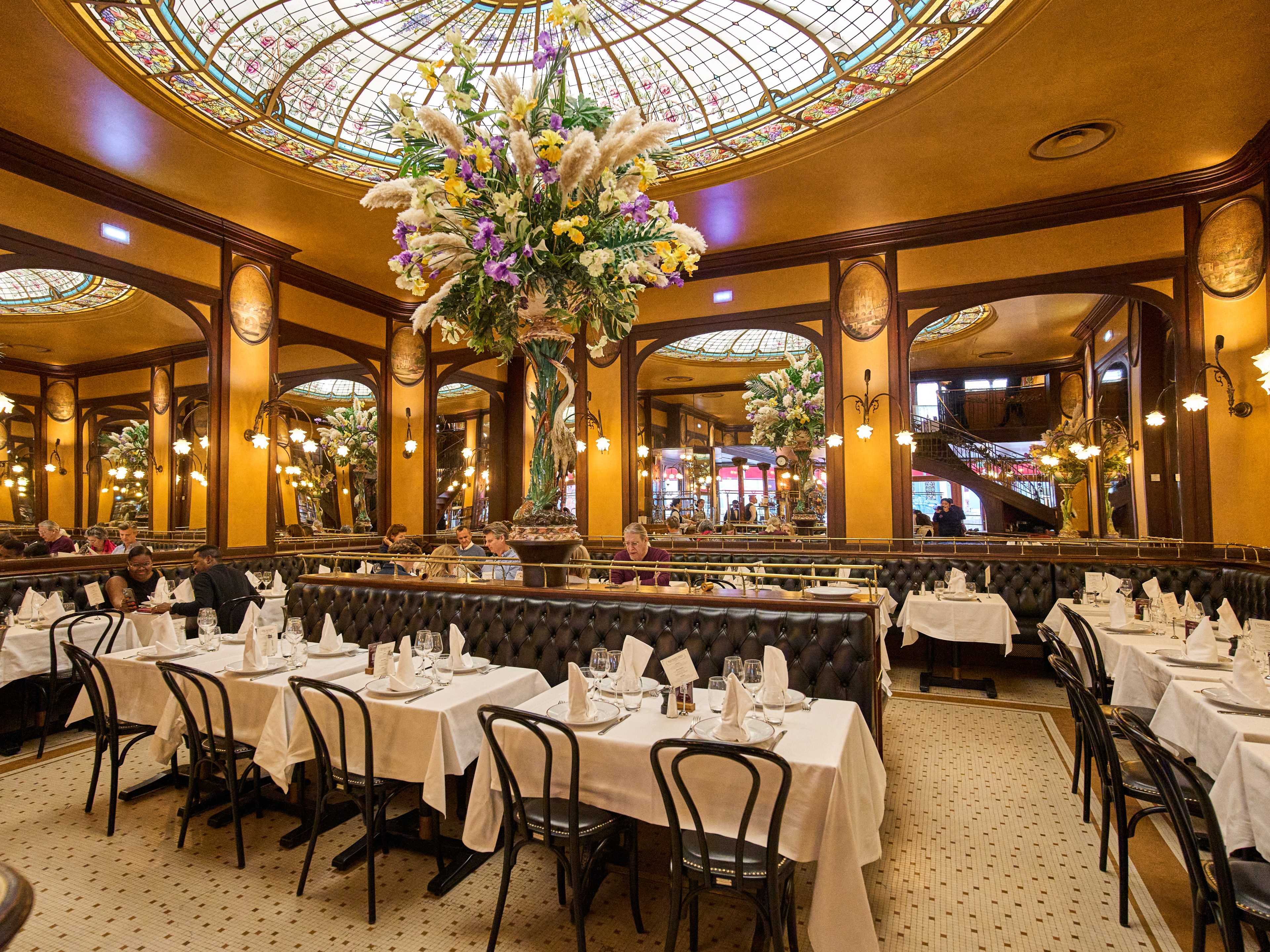 "Bofinger’s stunning seafood menu matches the grandeur of the space. The sprawling, 280-seat architectural marvel has soaring ceilings and a glass cupola buttressed by wooden walls depicting scenes of Alsatian village life. Even the bathrooms get a touch of glam with stained glass windows. Choucroute de la mer is the house specialty for good reason: salmon, haddock, bass, and prawns are artfully arranged around a mound of sauerkraut spiked with juniper and cumin, then generously doused in a rich beurre blanc that practically begs you to lick the plate clean. But fussier diners will also have their pick of fish and chips or steak-frites; choose the châteaubriand for a tableside flambage worthy of the luxurious space." - emily monaco