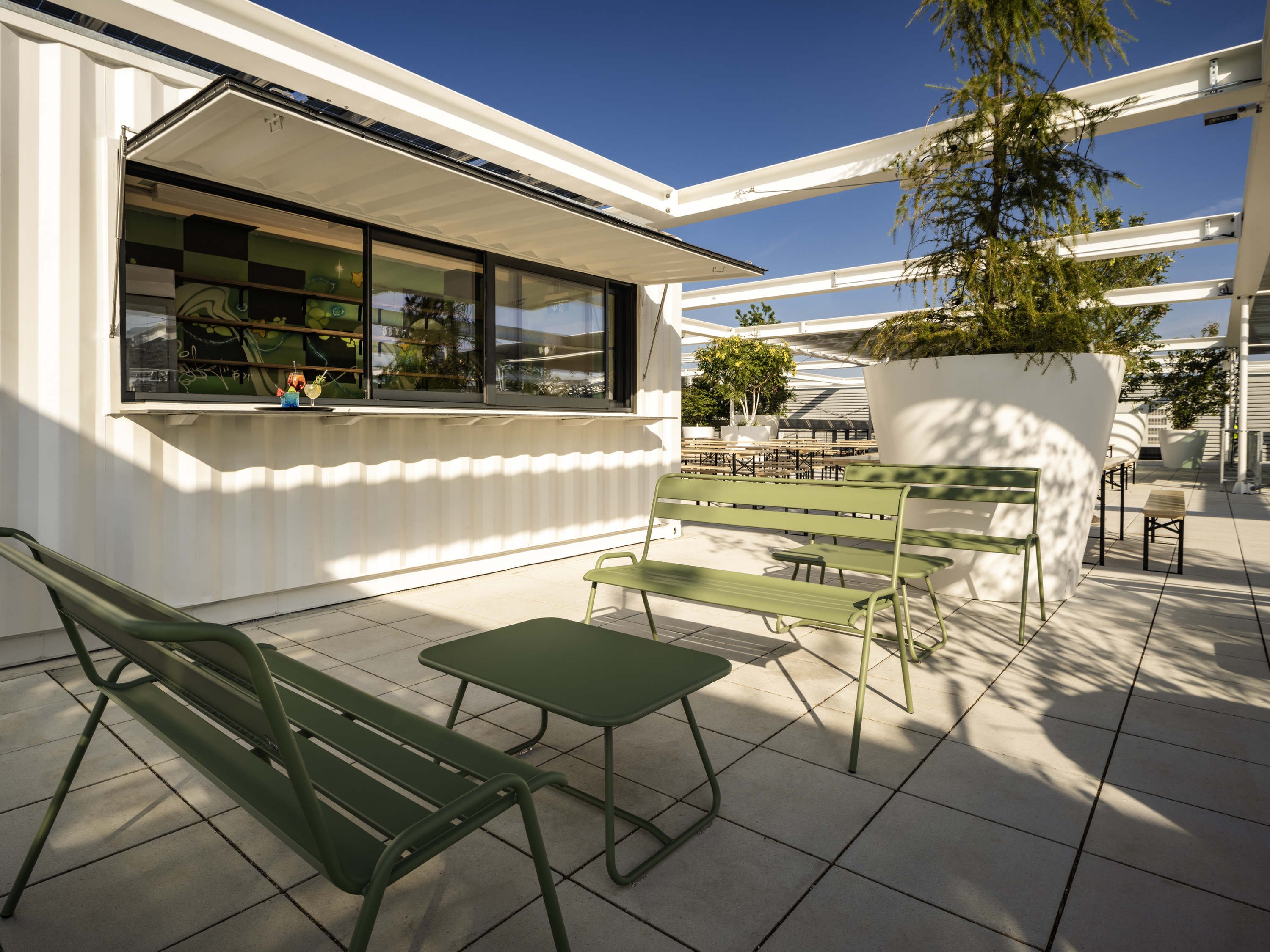 Sleek dorms, rooftop cafe, lively bar, and events.