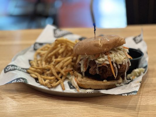 Poultry, wings, waffles & beer in rustic timber-lined spot