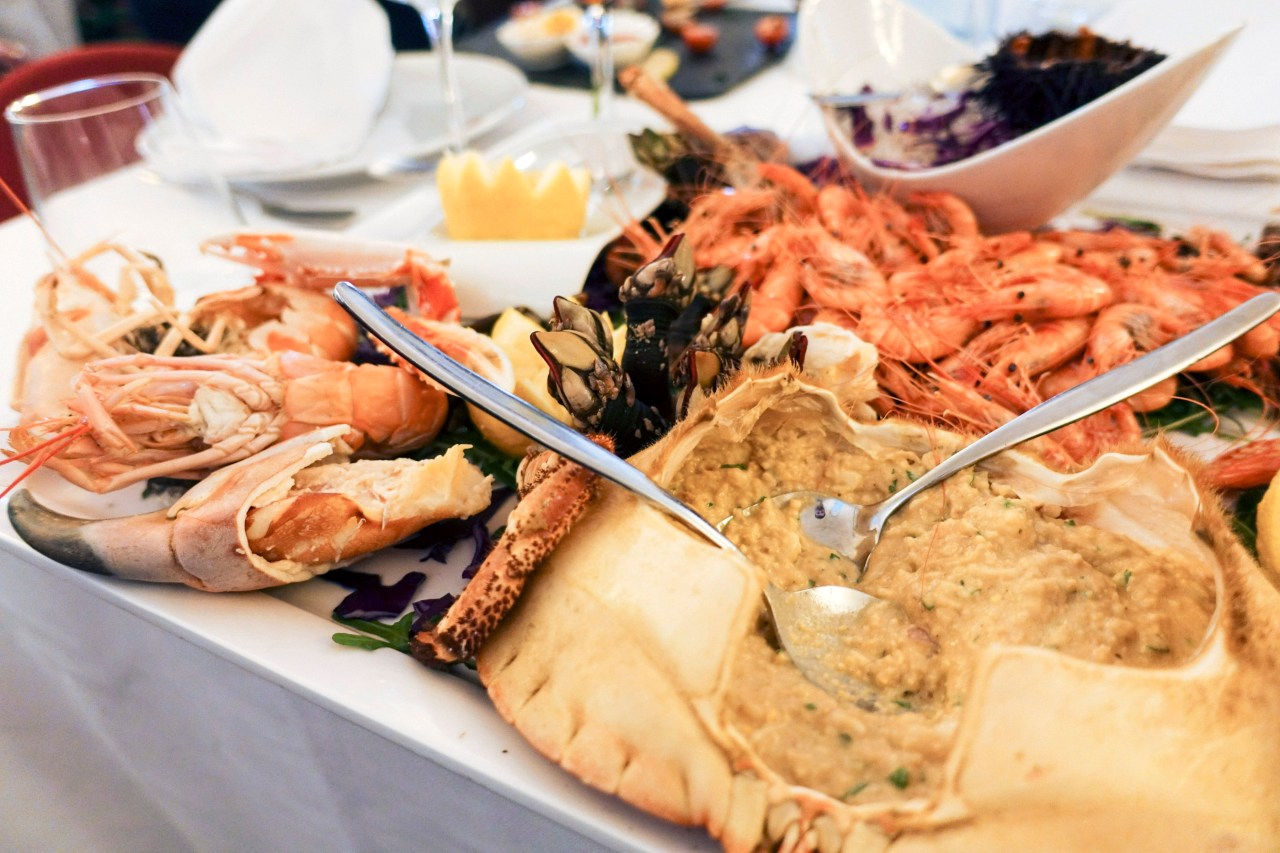 Tony had an enormous platter of seafood consisting of "coastal shrimp, local oysters and crab, sea urchin, langoustine, gooseneck barnacles, whelks, and clams, and a salt-baked sea bass."