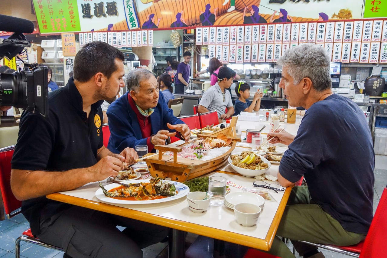 Bourdain had: Sake and quintessential Okinawan dishes, including tofuyo (fermented beancurd that packs a hefty punch, flavor-wise) and pork belly (cooked with stock, heavily infused with bonito flakes, pork ears thinly sliced and dressed in rice-wine vinaigrette, slow-roasted ribs brined in sake and seasonings.