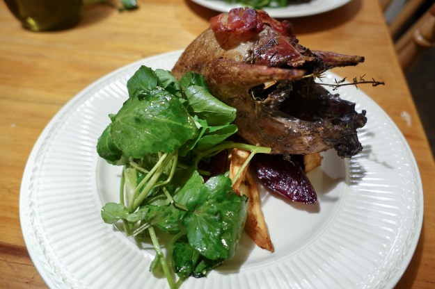 Tony had a home cooked meal made by Fiona Cullinane here with A.A. Gill, a restaurant critic. They had roasted grouse with bacon and bread sauce, and served with watercress, parsnips, and beetroot. The next day they went hunting and shot a deer, then had a meal of venison seared in duck fat and served with a pan sauce of red wine, butter, and currant jelly.