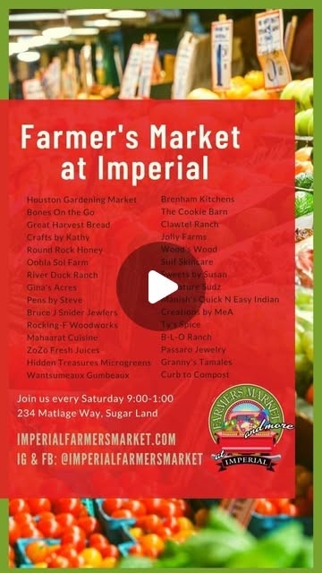 Run by the Fort Bend Chamber and confirmed by the city, this Saturday market draws area growers, small-batch makers, and musicians. It’s year‑round, with produce, honey, spices, baked goods, and food trucks.