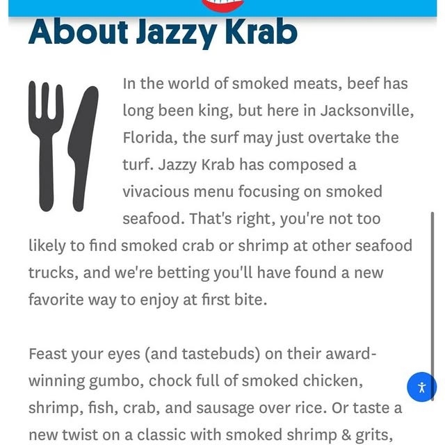 Smoked-seafood comfort—shrimp and grits, gumbo, crab-stuffed egg rolls—crafted by a chef with fine-dining chops. Spotted at the Jacksonville Jazz Festival’s vendor lineup and praised by catering clients throughout 2025.