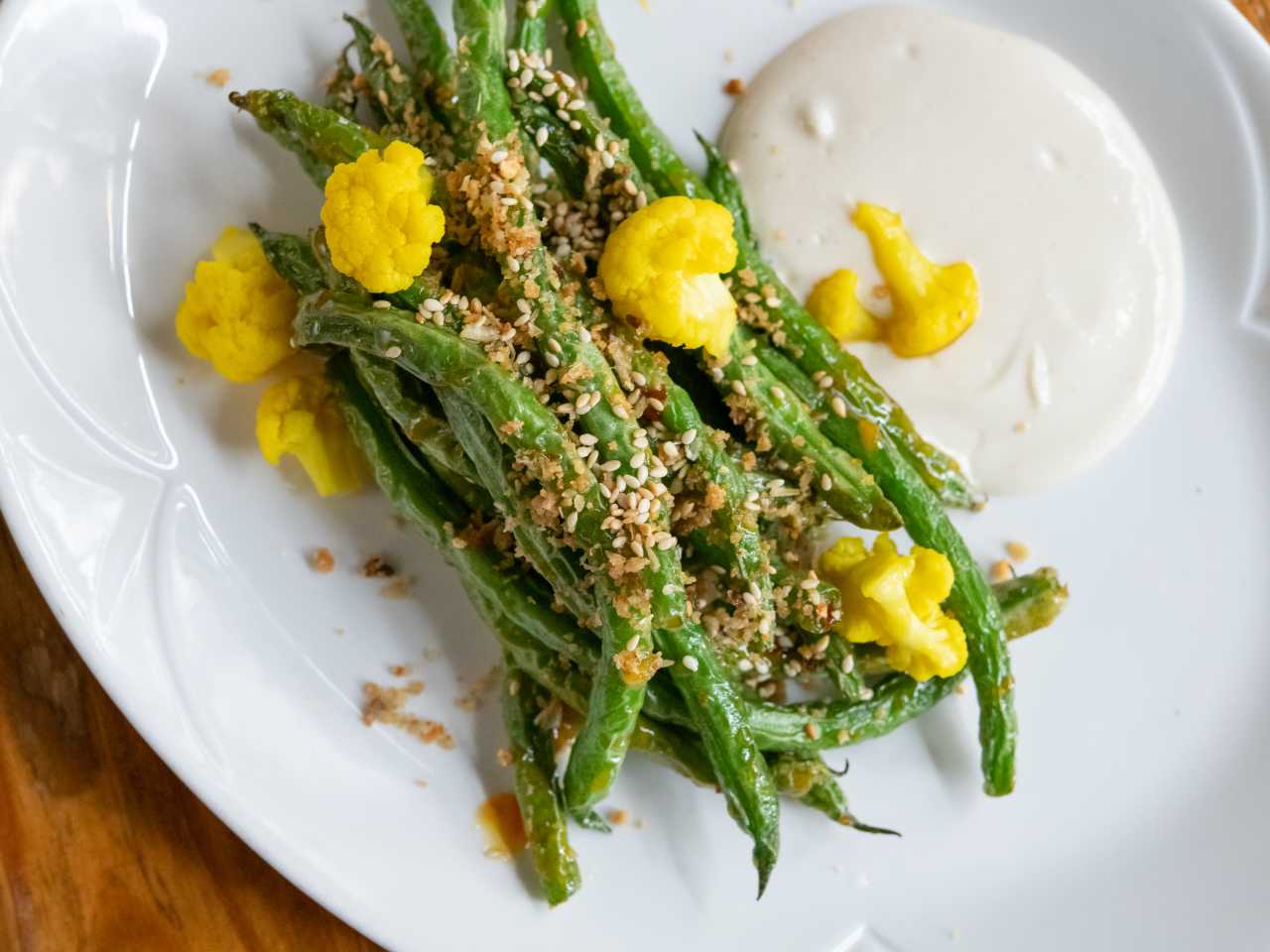"Agave Sambal Green Beans Don’t you dare mentally check out at the sight of “green beans.” Money Frog’s are some of the best vegetables in town. They’re dry-fried and tossed in an agave sambal mustard, served with blended tofu tahini, and sprinkled with sesame seeds and turmeric-pickled cauliflower. It’s sweet and salty, backed by subtle heat, and a superb way to get one of the five daily recommended servings of produce inside your body. " - aimee rizzo