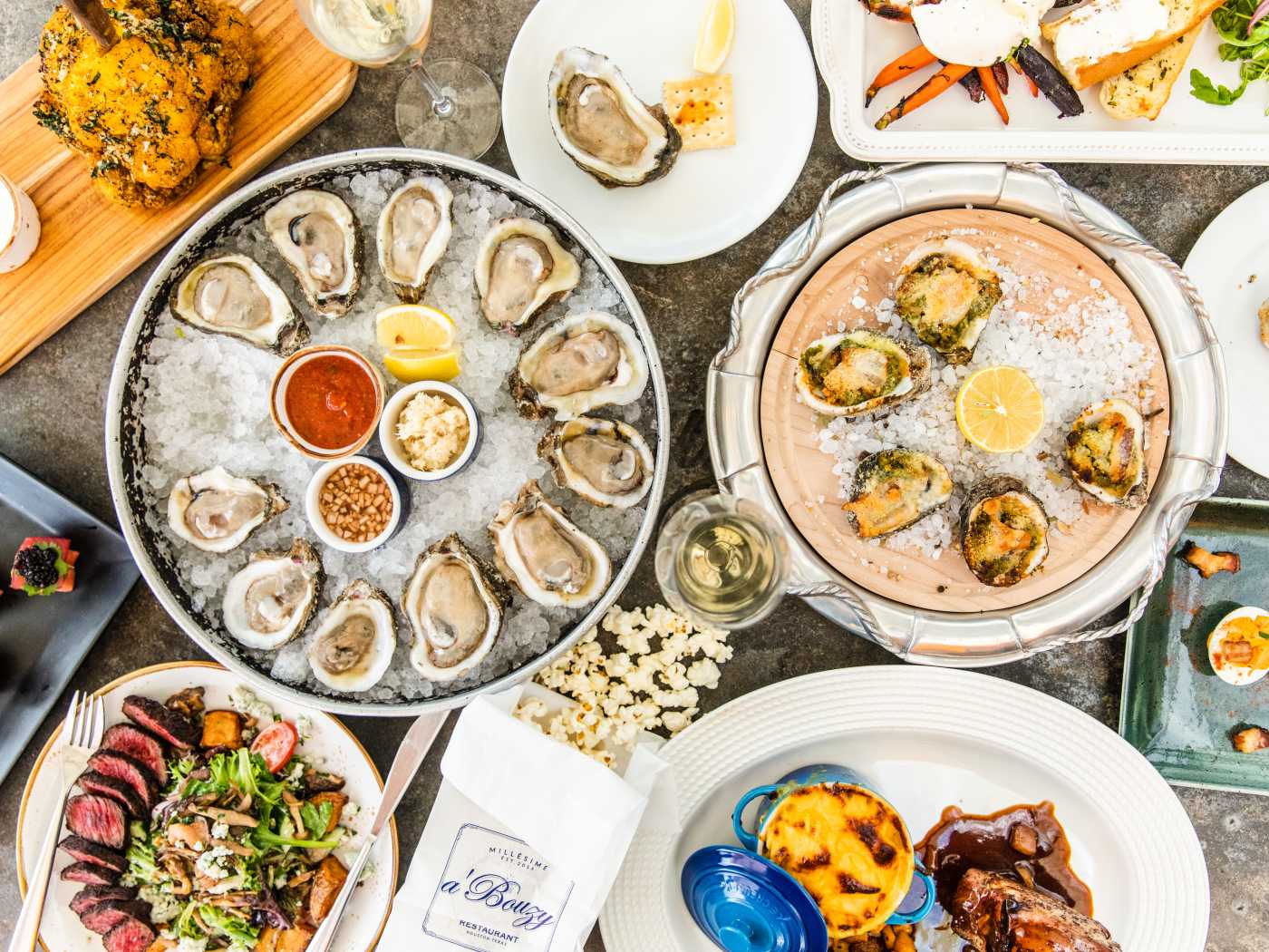 "The first thing the staff at A’Bouzy in River Oaks sets on your table is a paper bag full of warm popcorn—a not-subtle-at-all salty snack that suggests you’ll need a drink immediately. Given the length of A’Bouzy’s wine list, order a few bottles and add on moules frites or beef bourguignon. And while A’Bouzy is more ofwine barmasquerading as an excuse to throw duck fat on a brunch omelet, when you’re tossing back one of the dozen types of caviar on thepatioand trying to toss popcorn into your friend's mouth (you’ve had a lot of wine), labels don’t matter. Because even though this place has the look of a fancy River Oaks spot, everyone here’s in on the joke and mostly just wants to have a great time" - Team Infatuation