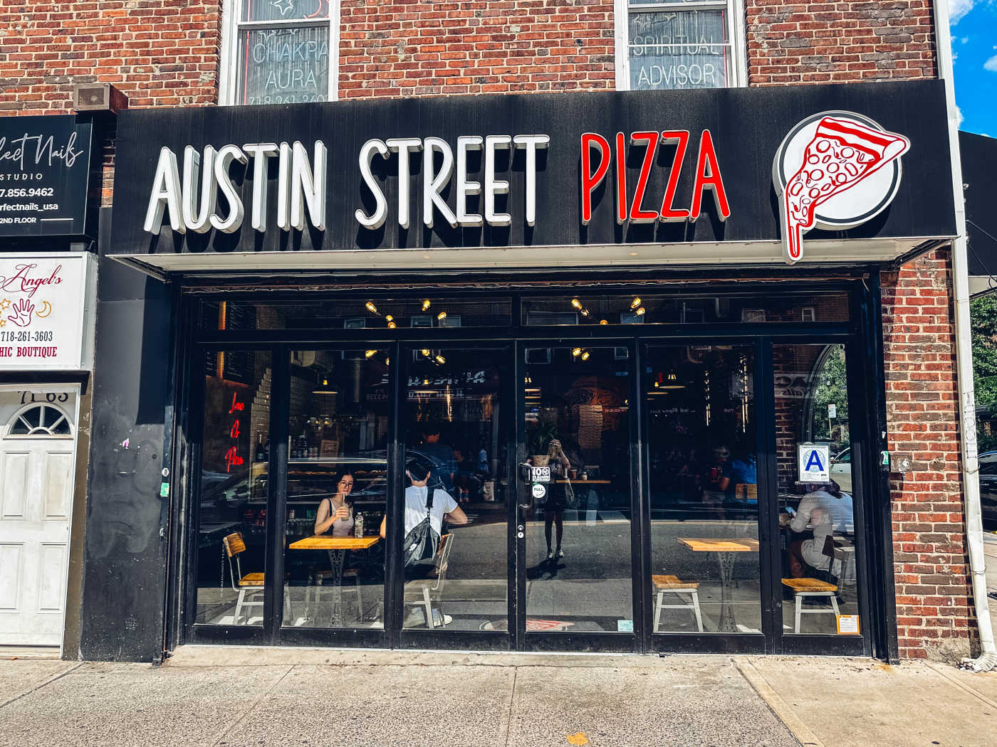 While walking along the main drag of stores on Austin St in Forest Hills, we always see people carrying Austin Street Pizza boxes and we were intrigued to try them out. In this corner store, the food prep area is way bigger than the seating area with a couple of stacks of smaller steel pizza ovens instead of the big hulking ones you normally see at other neighborhood pizzerias. The tables are only 2 seaters with both low tops and high tops, so if you have 3 or more people, you have to scramble to grab chairs to huddle around a small square table.