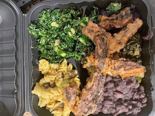 "Baba’s Vegan Cafe specializes in the kind of plant-based food that doesn’t pretend to be meat. And their rainbow-colored welcome plate has every kind of crunchy or creamy sensation you could possibly want in a plate of food. It’s essentially a vegan soul food sampler platter reworked with notably fresh vegetables, and it’s one of our favorite meals in South LA. The plate comes with baked mac and cheese topped with crispy fried cauliflower, plump black beans with rice, crunchy lentil fritters, and collard greens. They also serve Jamaican patties, smoothies, and a bunch of other healthy stuff on the menu." - nikko duren, kat hong