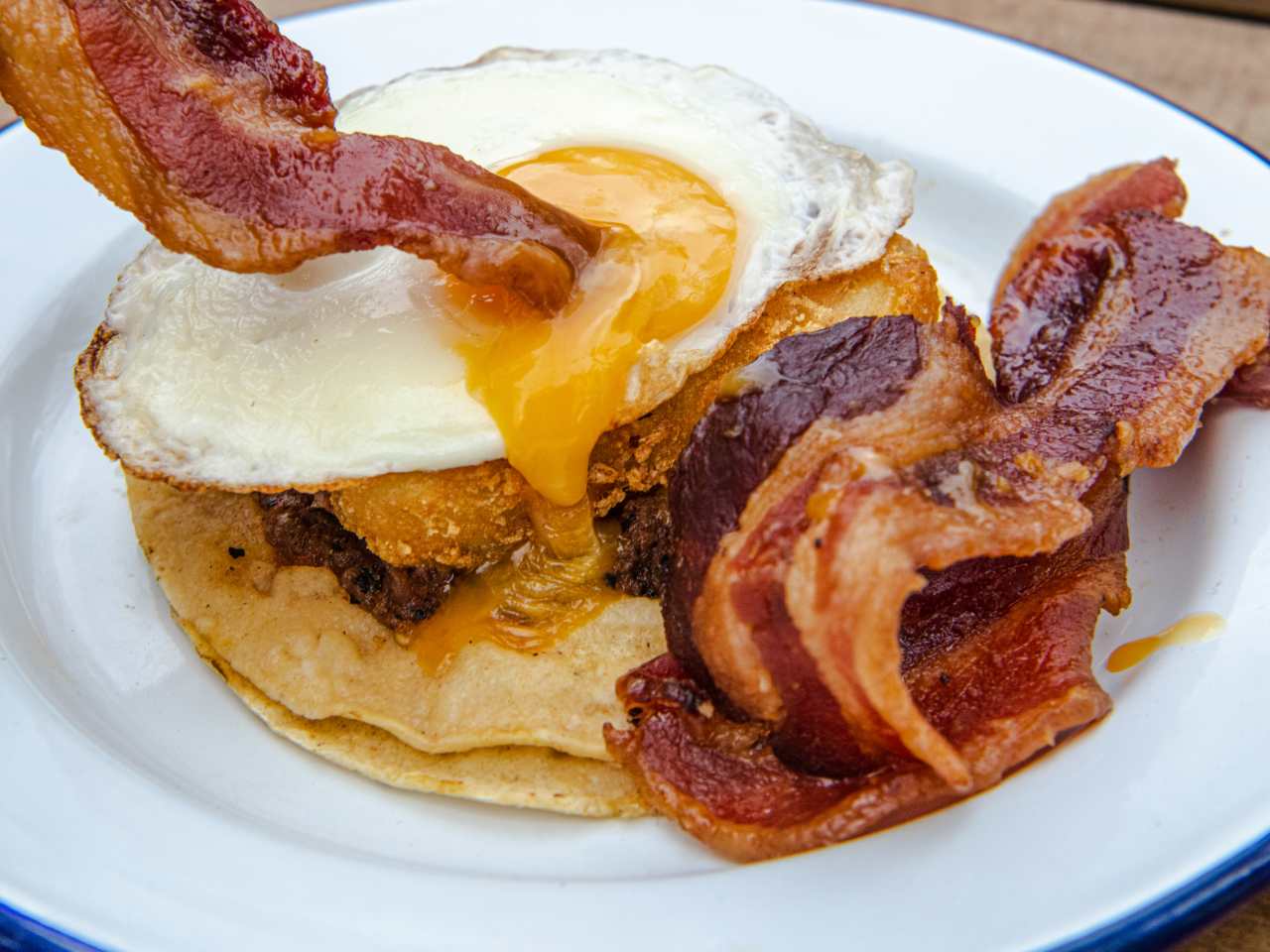 "A churchyard isn’t a conventional place to eat, but Bad Manners isn’t a conventional place. The Mexican kiosk, set among the gardens and gravestones of St John at Hackney church, slings excellent breakfast burritos and changing specials like kimchi-topped chilaquiles. But the hearty egg, bacon, and hash brown taco is a menu standout. This stunning stack strikes all the sweet, savoury, and carby notes with a soft tortilla, sweet salsa roja, a golden hash brown, glossy fried egg, and candied bacon. It’s a dish we’d brave the outdoor-only seating in all weathers for. " - jake missing, rianne shlebak, daisy meager, sinead cranna, heidi lauth beasley