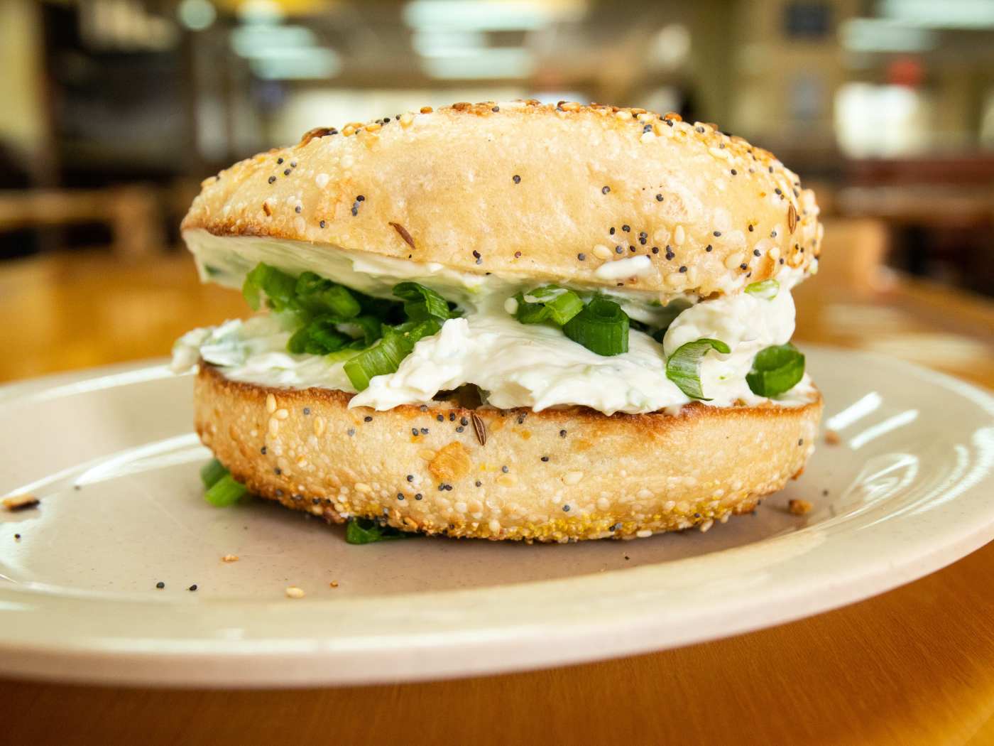 It's close by for me, it has a lot of bagels, a lot of restaurant space and an expansive menu with great sounding items to get lost in. We were looking for a breakfast place and had walked in after 11am on a Sunday, and the restaurant, both inside and outside, were 70% filled. The weather was nice outside, so we opted to sit in the covered patio. We did have to ask our server twice and another server once to lower the shade on the patio since the sun was beating down on his back. It turns out that the shade is power operated and needed the manager to retrieve the remote for it, which we didn't find out until the third time we requested for it to be lowered. We just got "okay" as a response for all 3 times.