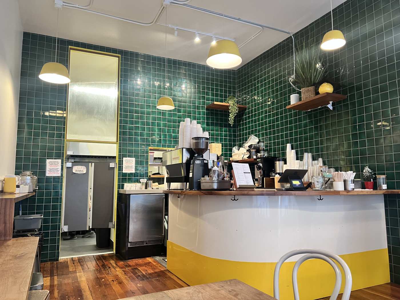 Casual, cozy, and compact space with several regular tables, two communal high tops, and counter seating.