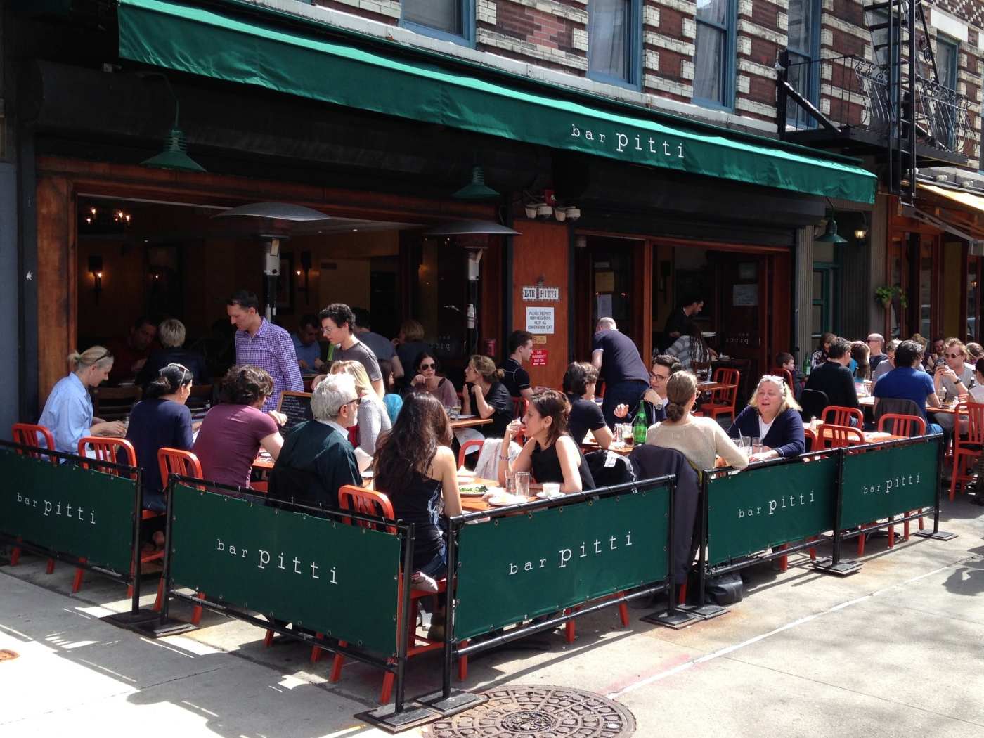 "Cash-only Greenwich Village mainstay Bar Pitti attracts a bafflingly random crowd. Respectable Italian food aside, the draw is the expansive sidewalk patio where you might see some tourists wearing sun visors, and tweens in soccer uniforms eating a few feet from a disinterested Justin Bieber. The place is walk-in-only, but that’s kind of nice. It gives the restaurant a democratic feel, and waits are never longer than 40 minutes or so. NYU students and people who got married at Lake Como A baseball cap pulled down low Rigatoni with turkey sausage and peas" - bryan kim, molly fitzpatrick, willa moore, will hartman