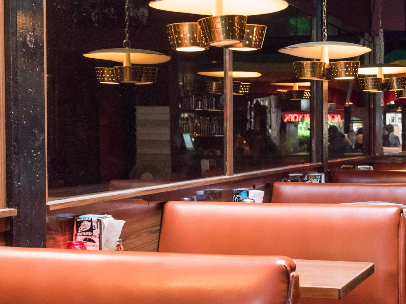 NYC-style pizza slices, cocktails & beer, retro vibe