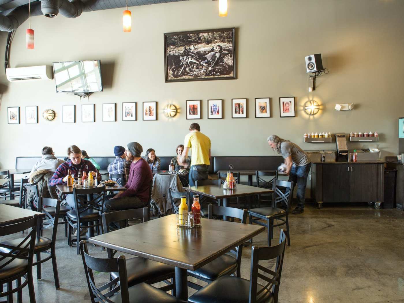"Watch any food channel's travel shows, and you’re bound to catch a segment on Biker Jim’s at some point, because it’s a TV magnet for its character as well as its food. Named for owner Jim Pittenger, an Alaskan-born ex-repo man with a taste for hogs on wheels and hogs—as well as just about every other animal—in buns, this is a rocking hangout at all hours, complete with burnouts (tire marks) from his own motorcycle on the floor for decoration. If you want a classic taste of Biker Jim’s, get the elk-jalapeño-cheddar dog topped with cream cheese and caramelized onions; after all, it’s what transformed his business from a humble street cart into a whole fleet of them, anchored by this brick-and-mortar institution in the Ballpark neighborhood. A visit here is something of a Denver rite of passage, which means you’ll find a cross-section of the city. Tourists cram between gaggles of Rockies fans en route to Coors Field just a few blocks away; families chow down alongside students; and on weekends, carousers taking a breather from their bar crawls fill every inch of available space." - Ruth Tobias