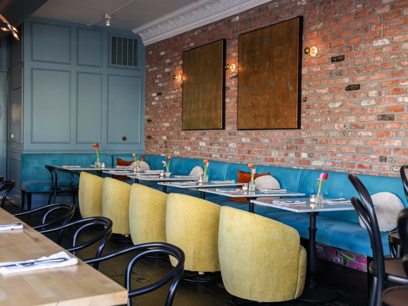 I was the first person in the dining room that evening. I was seated at a table along the robin's egg blue velvet banquettes on the right. However, along the windows on the opposite side of the dining room are a series of tables with "lounge" like chairs, that give the ambiance more the feel of an all-day hang-out coffee house rather than a proper restaurant. There was good jazz music on the restaurant's soundtrack, including haunting melodies by Billie Holiday.