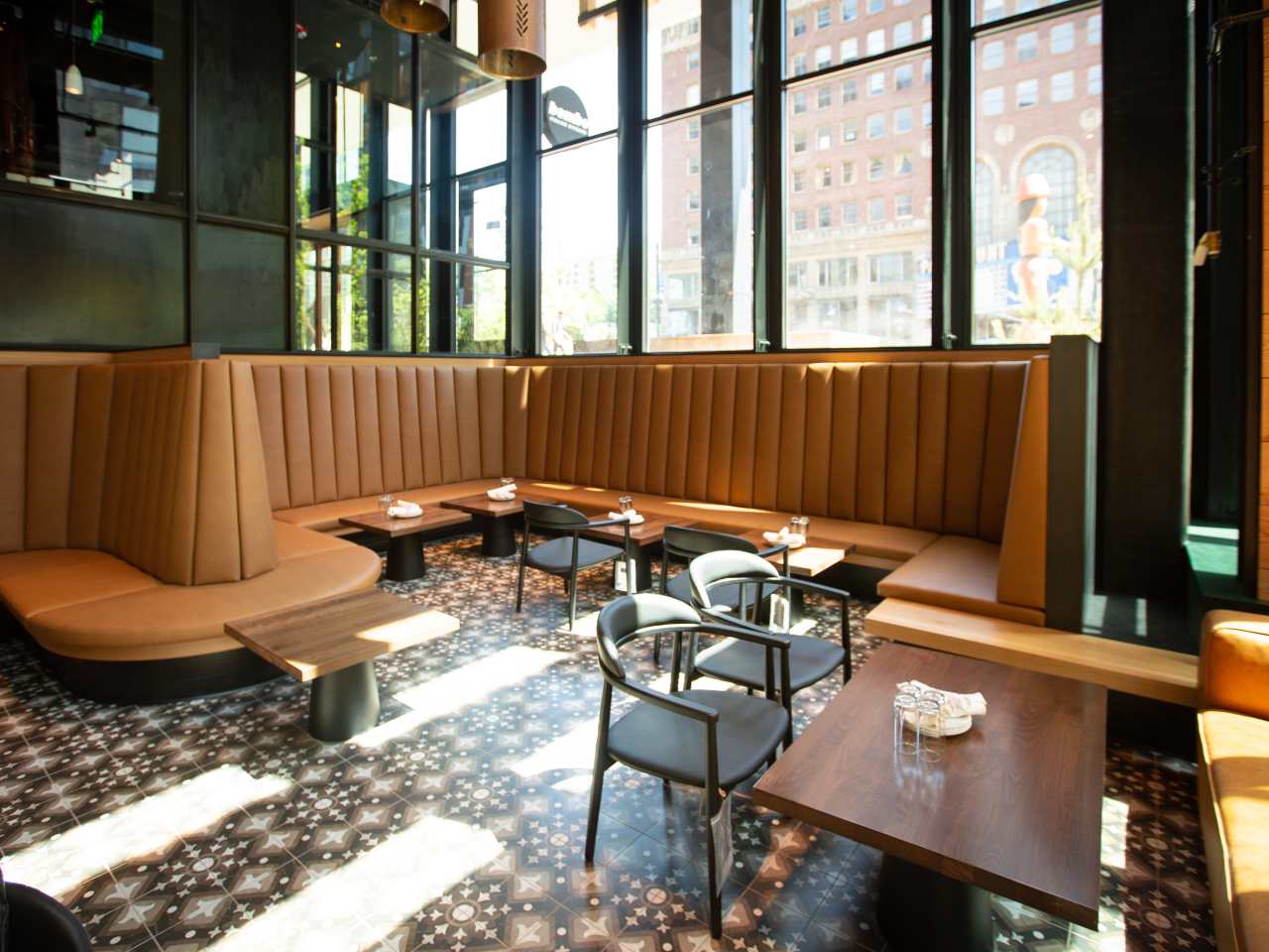Nice space inside Seattle Convention Center Summit. We made a reservation, as we had tickets to a show across the street at Paramount theater. Nice spot to grab a bite before a show. Service was nice, they were very attentive when we first got seated. After awhile, it's like they forgot about folks sitting outside. We ordered another round of drinks at 6 and it took almsot 20mins to get them... they weren't that busy. We ordered the mule and a shrub. Both drinks were good. We also ordered their Bomba pizza. It was pretty good. Needed more hot honey as you don't really taste it. Overall not bad flavor. Again, good spot to hit happy hour before a show at the Paramount theater.