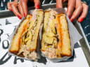 The sandwich to seek out. Tuna and artichokes get a punch from capers and pickled red onion, and it’s all tied together with gooey melted fontina. If you’re a tuna melt person, check this out for your own personal power ranking.