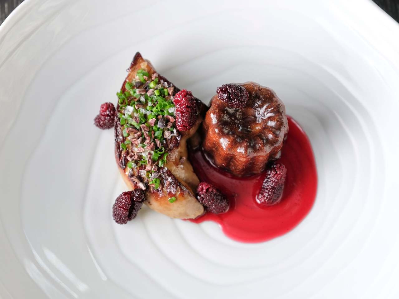 "Think of it as a French take on chicken and waffles, only with foie instead of fried chicken, canelé instead of waffle, and a tangy berry reduction instead of syrup. The foie is scored and seared on either side until the outside is caramelized. It’s topped with cocoa nibs that add a barely bitter chocolate flavor, and surrounded by vinegary berry gastrique. When you eat the creamy, fatty foie with every sweet and acidic component of this dish, your brain stretches like a dog after a delicious nap as it tries to absorb all the flavors at once." - virginia otazo, mariana trabanino, ryan pfeffer