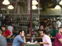 They make great use of this high-ceiling corner space - it's relatively unadorned, but they have revitalised the old tiles, added some high shelving, and used wooden countertops, wooden outdoor tables, and wooden stools. Actually the stools along the window are worth remarking upon in two sentences: they're marvellously engineered, but you'd really have to go there to see what I mean.