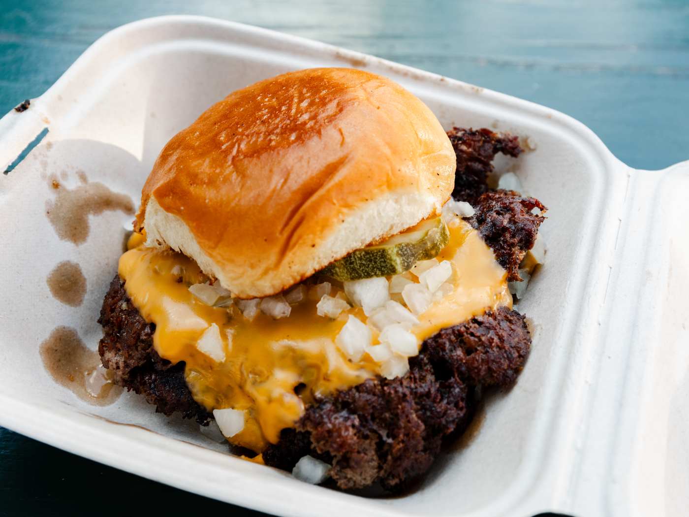 "This tiny, order-at-the-counter spot in Beverly Grove has a short two-smashburger menu, available as a single or double (plus a grilled cheese and fries that are complete afterthoughts). Flavor-wise, we like these burgers. Structurally? They’re a big mess. The pressed patties are nearly twice the size of the bun, with a juicy center and lacy edges that crackle like burnt toast. Rather than some sweet-tangy Thousand Island sauce, you taste dill pickles and a ketchup-mayo-mustard combo that oozes out the sides. We’d strictly come for the Oklahoma Burger, topped with a mountain of onions mushed into the salty patty. They add a nice caramelized sweetness, but also make the whole thing so heavy it collapses in your hands after two bites." - Sylvio Martins