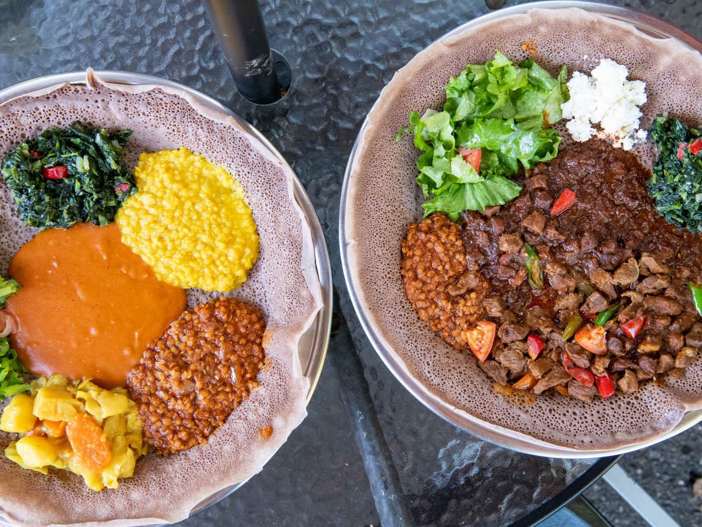 Ethiopian food with fava bean foul, meat tibs, and injera