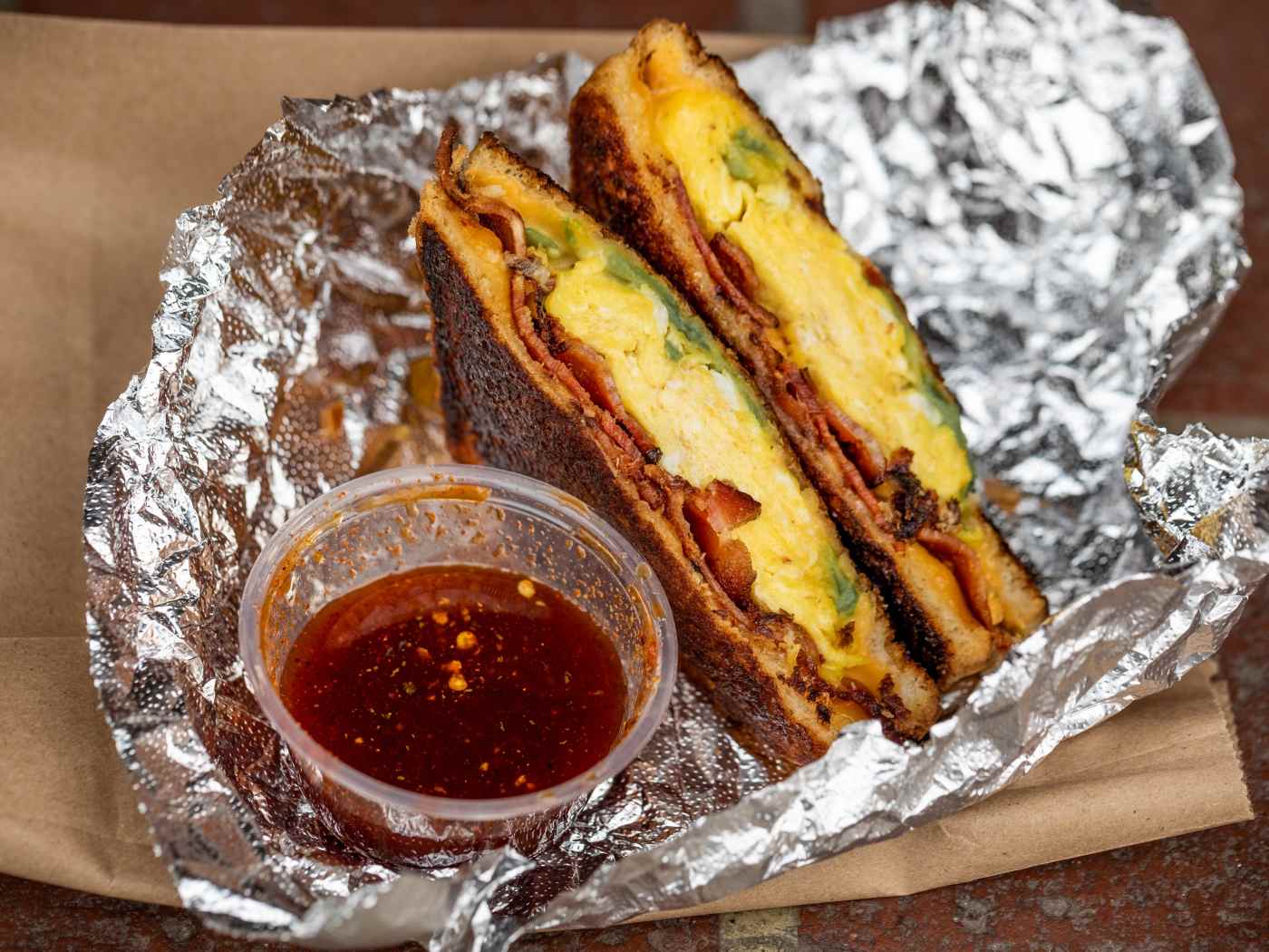 "Of all LA’s pandemic pop-up success stories, Calabama and its sandwiches lowered via red bucket from a fire escape was the most iconic. These days, the bucket is gone—replaced by a walk-up window in Hollywood—but the cheese-oozing breakfast sandwiches remain. Fillings are straightforward and glorious: soft scrambled eggs, avocado, grilled onions, brown sugar bacon (there’s a vegetarian option too), and several slices of molten american cheese on white bread toasted with a generous amount of butter. It’s a decadent morning meal, but not so rich it’ll send you back to bed. Throw on some smoky-sweet house dipping sauce for a tangy kick." - garrett snyder, arden shore, brant cox, cathy park