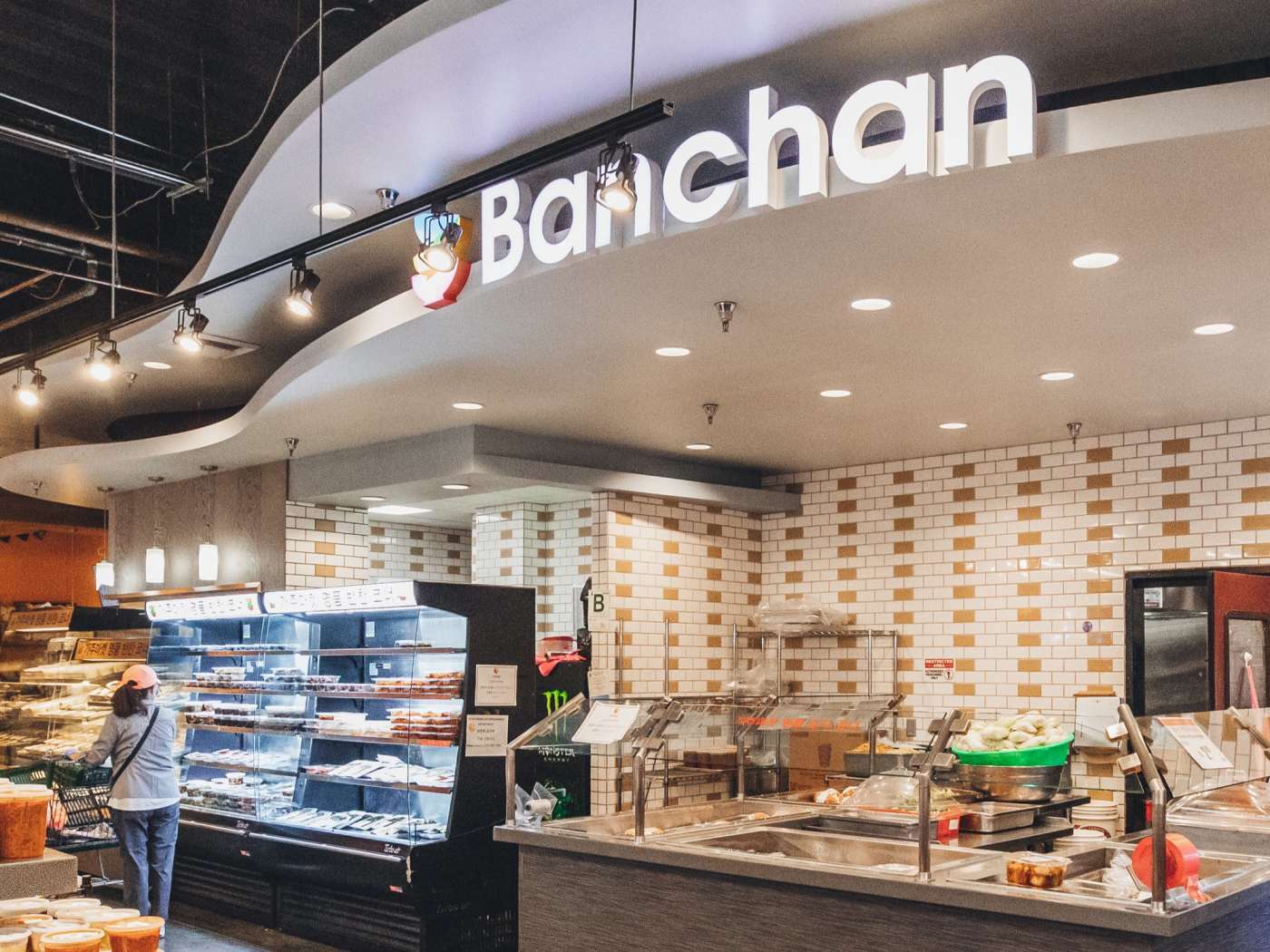 Grocery with Korean goods, food court, fresh produce, seafood