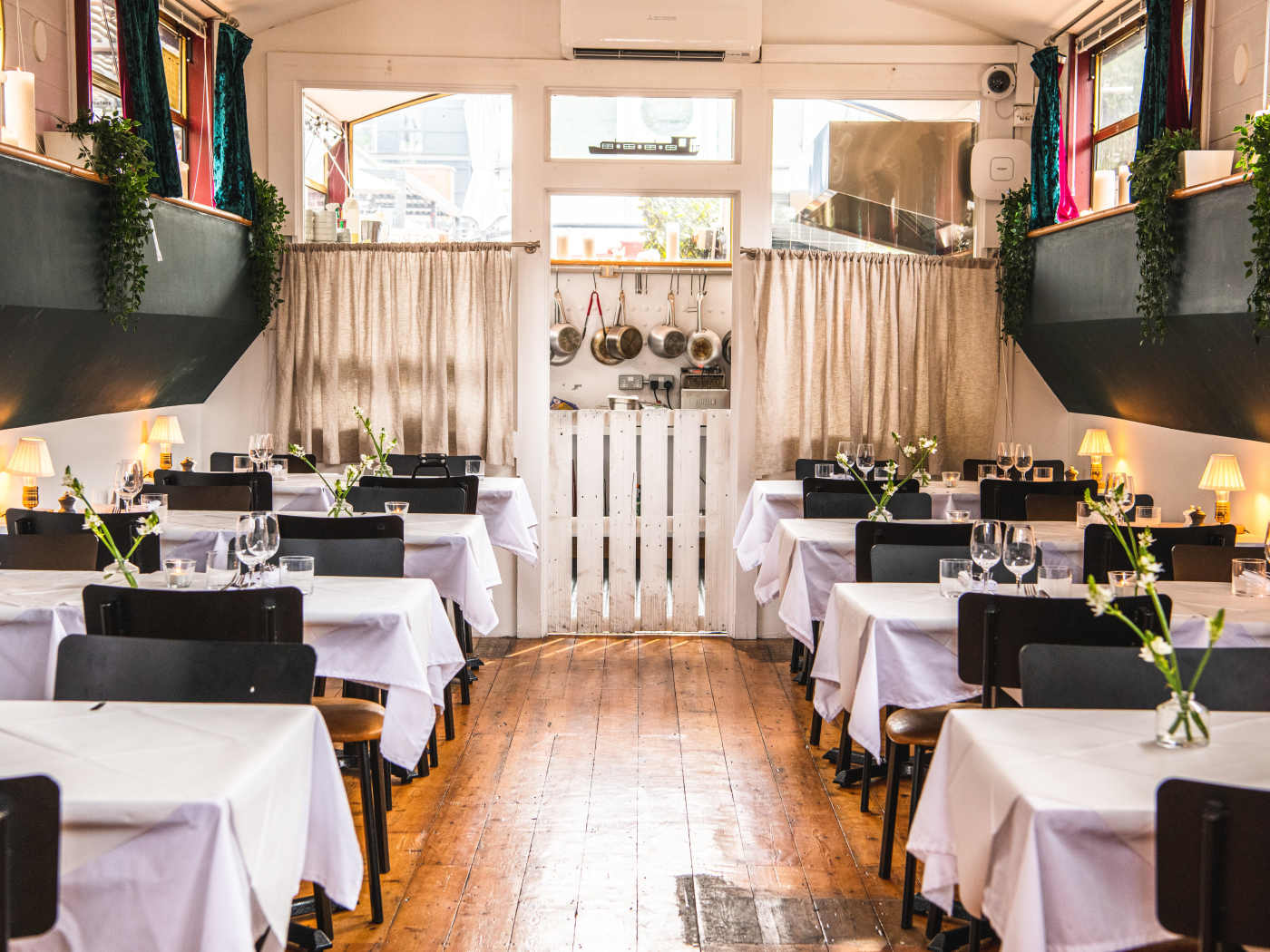Candlelit barge restaurant serving modern European bistro dishes