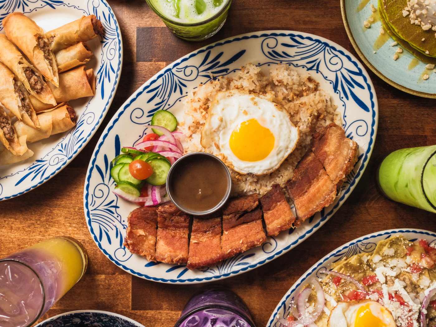 Modern Filipino cuisine with ube waffles, lumpia, and lechon