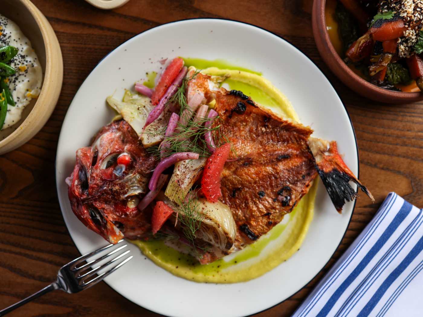 "At first glance the food at Cellar Hand is all-over-the-map, but it’s actually extremely local. There’s a double-digit number of farms and producers—including a ranch in Ramona where they source almost all their meat—on the menu. And even if you’re not in the habit of binge-watching homesteading videos on YouTube, it’s hard not to be impressed by the in-house baker and fermentation specialists at work. Their hard work goes toward chicken liver mousse topped with orange wine jello shots—served with sesame bread—and the delicate round of house-fermented, wood-fired pita paired with dips that include toum made with garlic grown at Sage Mountain Farm. The restaurant’s enclosed patio is a hub for happy hour, including half-off glasses from its own Pali Wine Co." - Team Infatuation