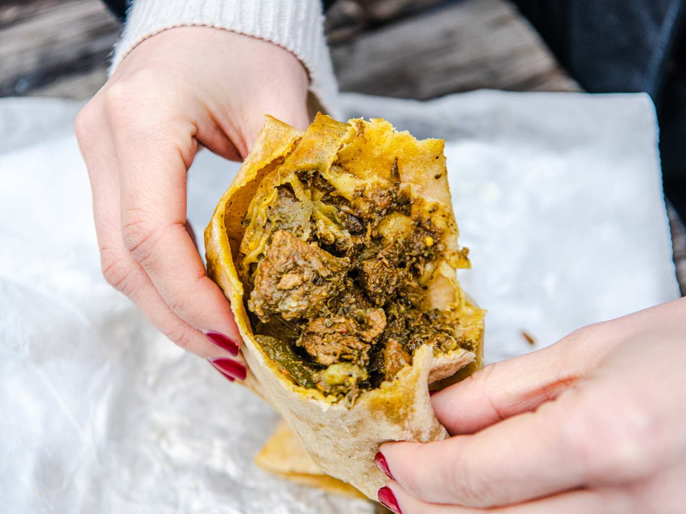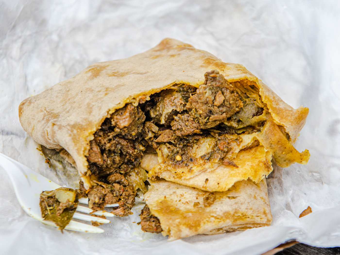 Homemade Caribbean roti with curried goat, chicken, or veg