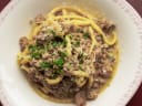 Malfadine Pasta with Lamb: I haven't had malfadine pasta before, and I must say I really enjoyed this type of pasta (it's probably one of my favorite shapes)! It's sort of like lasagna sheet ribbons and the sauce really helps cling to the noodles. The dish is really creamy, hearty, and rich with pleasant aromatic flavors from the onion and lamb. The lamb isn't too gamey and has a delicious meaty texture and flavor.