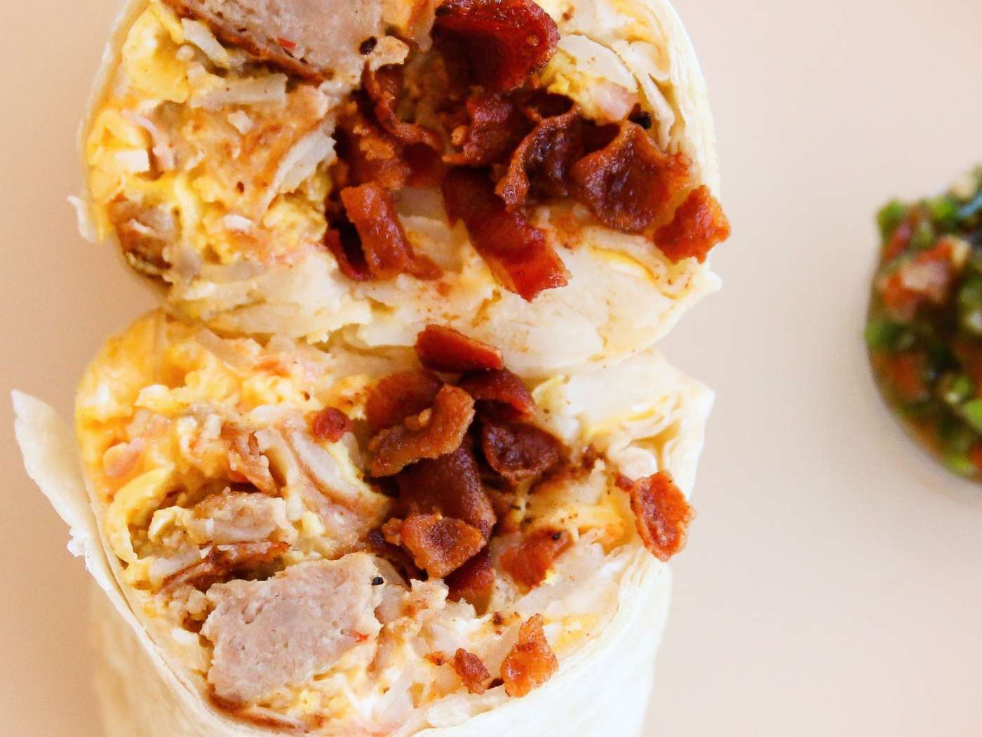 The meat options vary from ham, bacon, sausage, and/or steak. Ham is OK, smoky and thin sliced ham you'd expect in an omelette or a sandwich. The bacon is crumbled to bits so you get it pretty dispersed throughout the burrito, but you never get that crunch or chew from a bigger piece. I've never had the steak, since I always get the sausage burrito. It's the best one since it's chopped up sausage links chunked throughout the burrito. It tastes very similar to the Farmer John's breakfast sausages you'd grow up with living in Los Angeles.