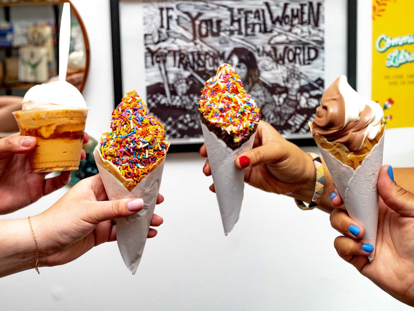 "In this town, we may think the end all, be all of ice cream creativity is rooted in twists, dips, or sprinkles (possibly jimmies depending on where you’re from). But at Manayunk’s Crust Vegan Bakery, not only do they have soft serve flavors like Thai tea ice cream, but you can put it in coconut, dark chocolate, and French vanilla waffle cones. They also have ice cream sandwiches, and if you want to really get wild, you can still make it a twist or top it with rainbow sprinkles in the end." - candis mclean, alison kessler