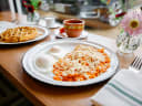 Because Cucharita is open from 7am to 3pm everyday, you can have a long, relaxing, and dare we say, positively leisurely meal at Cucharita. Try the chilaquiles, a staple Mexican breakfast of fried tortillas drizzled in thick crema and salsa. Or the savory huevos motuleños mixed with peas, ham, and salsa smothering fried plantains. Even the coffee drinks are served with a tiny shortbread cookie. And everything arrives on, you guessed it, delightful ceramic and enamel plates.