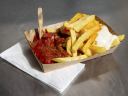 Locally sourced sausages, curry sauce & fries in industrial venue