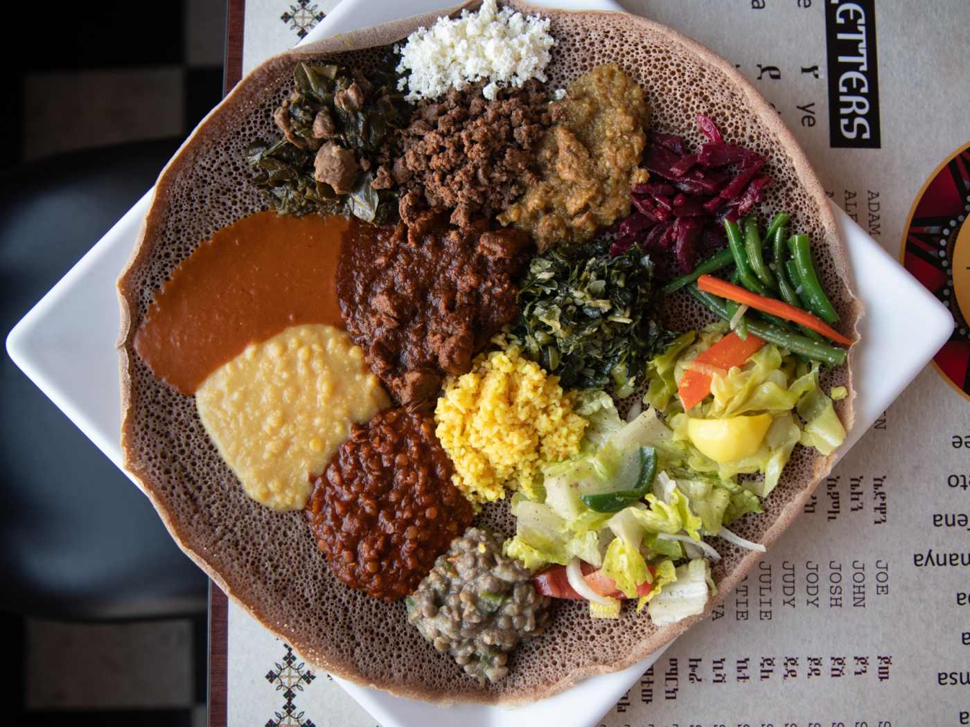 "We could write a novel about the Delish special vegetable combo, and most of the chapters would be declaring our love for the fasolia, complete with green beans and potatoes in a smoky sauce, as well as their stewed beets. Many table settings here feature the traditional mesob, a colorful round table woven from sweetgrass, which encourages communal eating—the whole concept is treated like its own ingredient in Ethiopian cuisine. Most of the fun is reaching around the circle to take bites of different flavors, and the combos are perfect for that, whether you’re dining solo or with a group. Just don’t forget a round of Ethiopian wine or beer. Or both." - lidiya belete, aimee rizzo, kayla sager riley