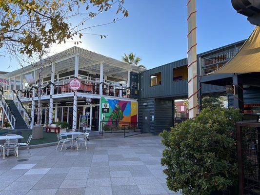 Outdoor shopping mall from shipping containers with shops, bars, eateries