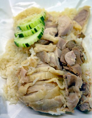 "Hainan, the island of China’s southernmost province, is famous for its chickens, which are poached in a gingery broth and served with soy sauce. This cafe specializes in the Thai take on the birds. The leftover broth is used to cook the rice that’s served with the sliced chicken — organs and all — along with some cucumber slices for contrast. A fortifying meal costs around $10." - Eater Staff