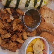 I enjoyed the chips and salsa (which wasn't particularly spicy), but the main dish was just OK. The chicken was pounded thin and breaded, almost like a Mexican Milanese, but there wasn't much in the way of flavor, and the chicken was a little on the dry side (it's easy to overcook something that thin). The rice and beans were fine, and the tortilla seemed nicely made. The salad was some undressed iceberg lettuce, a slice of tomato and some radishes. Maybe that was the point, but it didn't add much to the dish. A few slices of avocado mingled with everything else. I tried squirting the accompanying lime on the chicken (it wasn't an especially juicy lime), and copiously added salsa. However, ultimately it was filling but not flavorful.