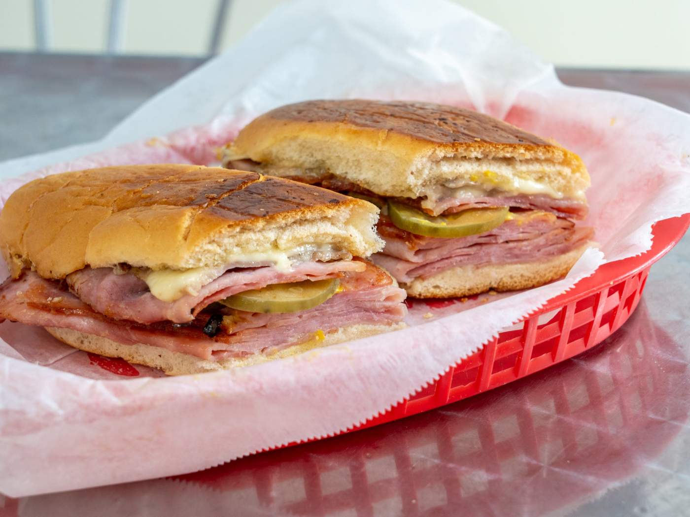 "At Enriqueta’s Sandwich Shop the fluorescent walk-up window resists modernity, and despite neighborhood change the place feels the same; their classic Cuban spills from a wax-paper-lined red basket—the Cubano Doble is a favorite, stuffed with two kinds of pork (one traditional sliced, the other pulled after being rendered with mojo and red onion) stacked between crusty Cuban bread baked locally for Enriqueta’s." - ByCarlos Frías