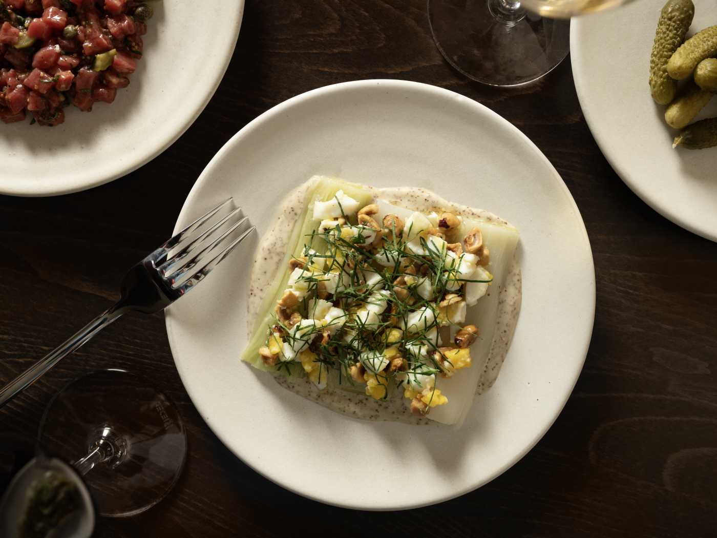 "If Place des Fêtes checks every third-date box we have, Entre Nous, from the Fradei team, is a casual, sexy wine bar that does the same for first dates. Think a long bar with plenty of tables, an interesting list of low intervention French wines, and big glass windows that get very foggy when it’s cold out. Plus, there’s an awesome seafood plateau, with pickled mussels that we yearn for, plump shrimp, and excellently shucked oysters. They have a handful of larger plates—we quite like their tartiflette croquettes and leeks in vinaigrette—but this spot is best used for snacks, like fatty and glorious pork rillettes." - willa moore, bryan kim, molly fitzpatrick, will hartman, tiffany yannetta, neha talreja