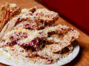 "A lovely, flirty little salad. This is the kind of dish you’d “throw together” for guests after spending seven hours sourcing the ingredients and grimacing at the price of chicory at the Hollywood farmer’s market. Each crunchy leaf is evenly coated in dressing, as if the kitchen dipped them one by one. The bitter greens sync perfectly with the bold anchovy dressing, which has a briny-peppery punch. And much like Megan Thee Stallion’s signature “ahh” ad-lib, the blanket of grated egg yolks over the top adds a subtle richness that ties the whole thing together." - brant cox, cathy park, sylvio martins, arden shore