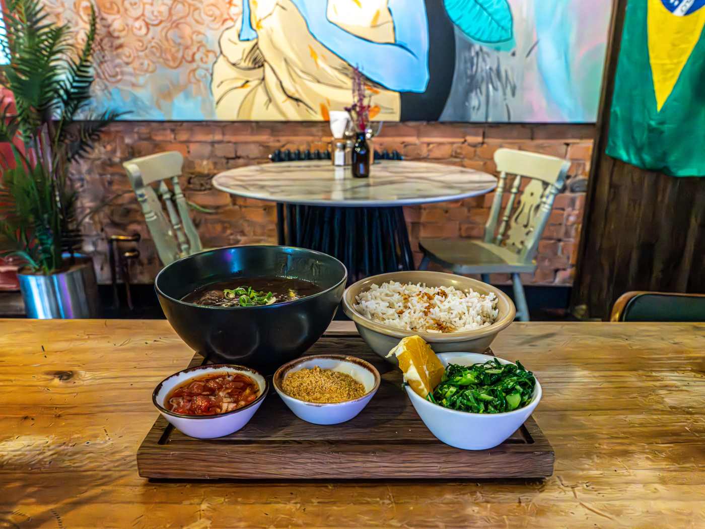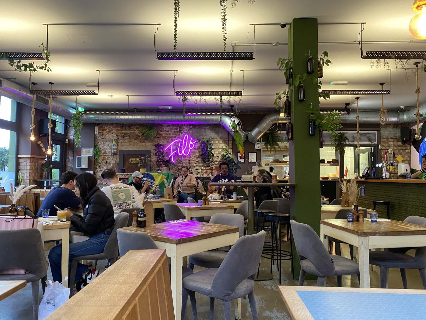 "Grab one of Filó Dining’s outdoor tables in the late afternoon sunshine, order a caipirinha or a pint, and you could almost be forgiven for thinking you’re at a bohemian São Paulo bar, not in Islington. Inside it’s a pub-cum-restaurant and exudes fun, with colourful murals and Brazilian flags adorning the walls. Whether ordering from the snacks (what Brazilians call petiscos), starters, or mains sections of the menu, the portions are generous, featuring Brazilian classics with modern twists. Pork ribs are rubbed in molasses atop moreish creamy cassava. Minas cheese, which chef Aline Quina makes herself, is salty, squeaky, and drizzled with truffle honey. A “ceviche” of palm hearts, mango, and avocado is a rare good vegan dish at a Brazilian restaurant. The star is feijoada—rich, creamy, with all the trimmings. Go when there’s live music and you’ll probably stay, snacking until closing time. Quina’s homemade pão de queijo, by the way, are possibly the best in the city.
