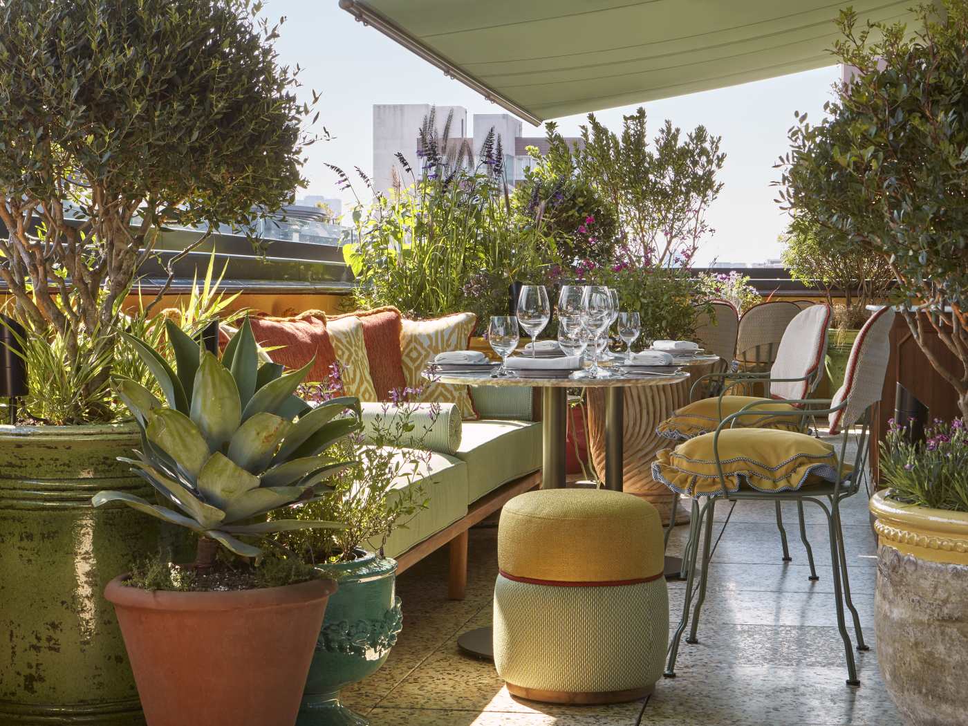 "Flute, the rooftop bar at London's Broadwick Soho hotel, features a bold pattern-on-pattern design and playful cocktails. The venue is dimly lit and has a lively atmosphere, with an outdoor terrace that becomes a social hotspot in good weather. The drink to order is the 'Eyes Wide Shut,' with aquavit, blood orange, cardamom, sherry, lemon, and bitters."
